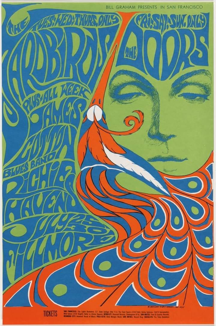 By Bonnie MacLean. Poster quảng cáo cho buổi hòa nhạc của The Doors và The Yardbirds, tổ chức tại Fillmore Auditorium ở San Francisco.