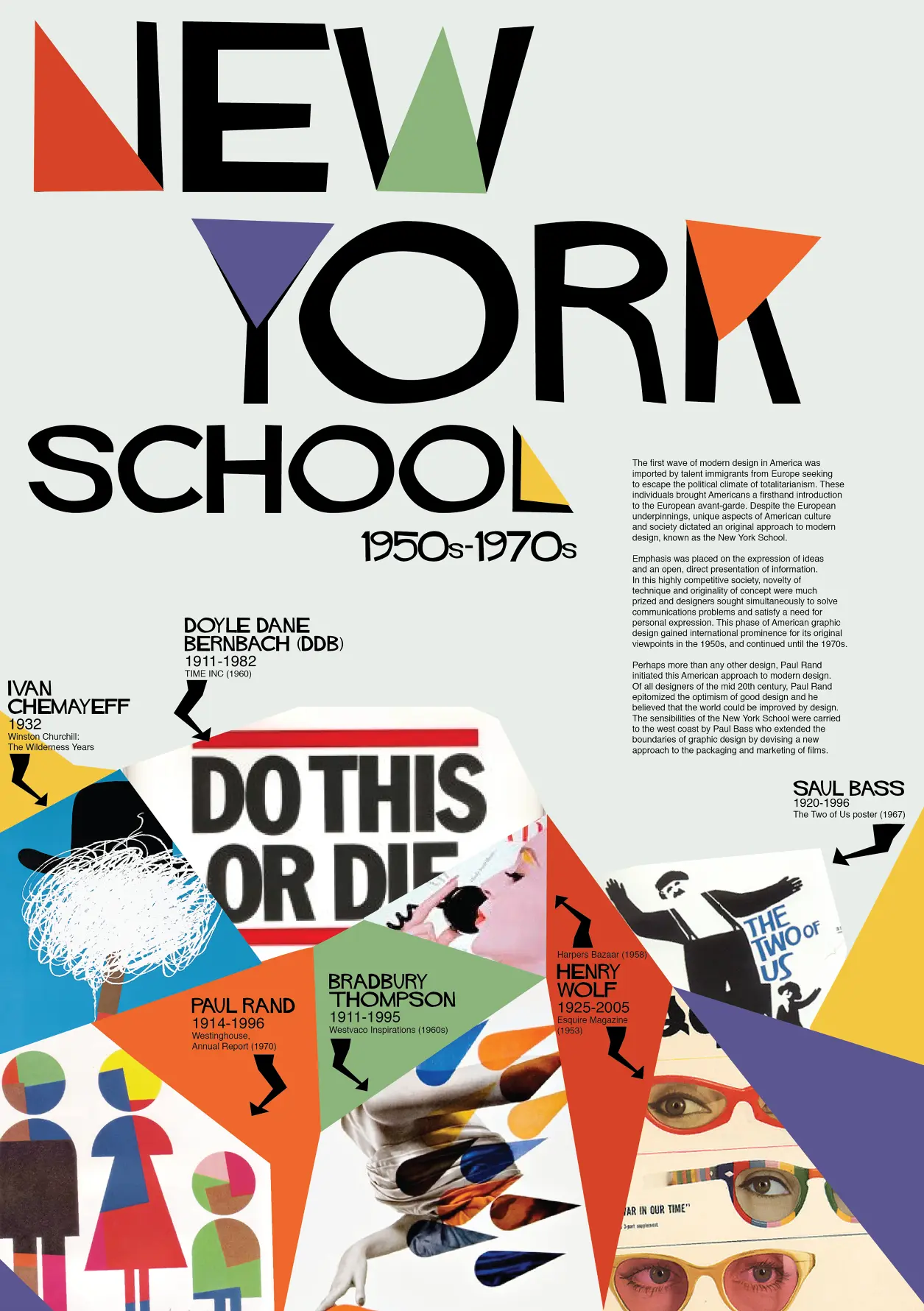Phong cách New York School xuất phát từ một nhóm nghệ sĩ sống tại thành phố này vào những năm 1950 – 1960. Họ thành lập một nhóm nghệ thuật không chính thức gọi là The New York School, với tác phẩm chịu ảnh hưởng mạnh mẽ từ vũ đạo, thơ ca và âm nhạc, dẫn đến một phong cách thiết kế tiên phong: tự do, tươi sáng và cực kỳ thử nghiệm.