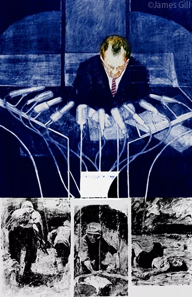 James Gill là một nghệ sĩ Pop Art khác cũng khai thác hình ảnh các nhân vật chính trị và những sự kiện thời sự, nhưng với giọng điệu phê phán sắc bén và trực diện hơn so với nhiều nghệ sĩ cùng thời. Tác phẩm The Machines (1965) khắc họa hình ảnh Nixon phát biểu trước hàng loạt micro, với những sợi dây cáp kéo dài xuống phía dưới, dẫn thẳng vào các bức ảnh về chiến tranh và cái chết.