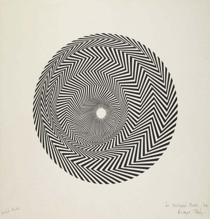 Họa sĩ người Anh Bridget Riley là một trong những gương mặt nổi bật nhất của phong cách Op Art. Tác phẩm Blaze năm 1964 của bà sử dụng những đường zigzag đen trắng, tạo nên ảo giác về một chuyển động xoáy tròn đi xuống.